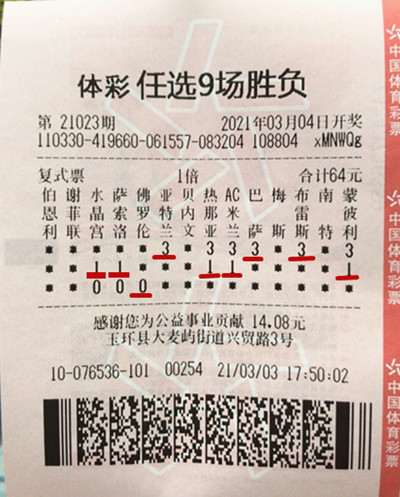 3月4日,体彩传统足彩第21023期如期开奖,位于台州市玉环大麦屿街道兴贸路3号3310076536实体店传出喜讯,该店一资深传统足彩购彩者喜中传统足彩任选9场1注,奖金10354元。