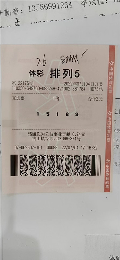 在体彩众多玩法中,他尤其喜爱大乐透,几乎期期不落,7月4日,他和朋友一起到古山镇这家体彩店购买了一张大乐透复制追加票,顺便又利用手中的2元零钱随机购买了一组排列5。