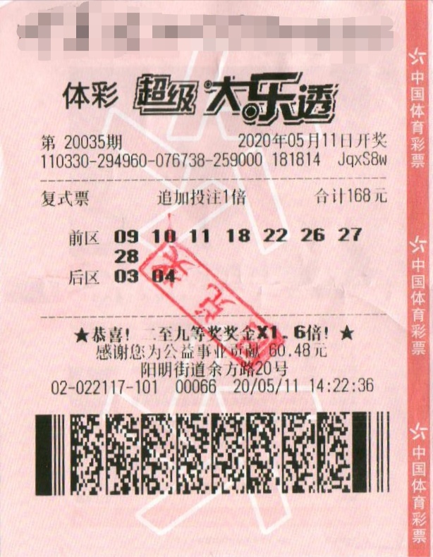 6月1日,体彩大乐透第20044期开奖,开奖号码:“01 03 22 28 30 +02 05”,位于衢州华阳路66号3308066514体彩实体店迎来一片喝彩。原来当期正在店内等候开奖结果的购彩者喜获追加二等奖一注,因同时中得幸运奖派奖,奖金乘以1.6倍,单票奖金46万元。 这次中出的二等奖是