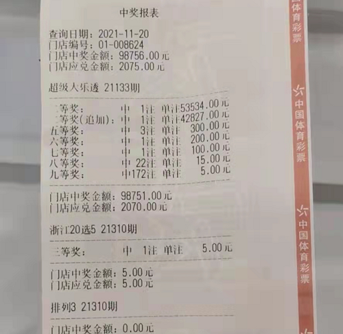 同一时间,几百米之外的位于杭州余杭区闲林街道闲富中路171-1号101室的3301008624实体店也传来喜讯,有幸运购彩者喜中大乐透追加二等奖1注,共收获奖金9万余元。大乐透这次在闲林鸣了个幸运双响炮。真是可喜可贺。(朱鹏)