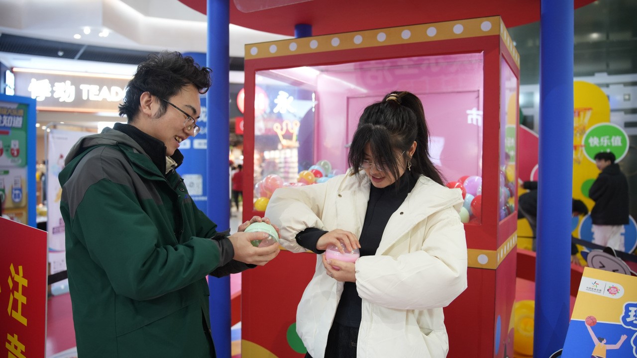 随着投币投入机器、手柄随着扭动“咔哒”转动,一枚扭蛋应声落下。打开扭蛋的瞬间,总是伴随着惊喜的呼声。奕可小朋友一脸兴奋地向父母展示着她刚扭出的奖品,“是海底捞菜品折扣券,我又可以跟爸爸妈妈去吃火锅了。”