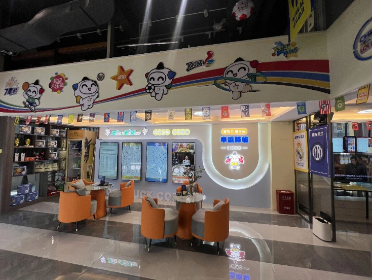 黄蓝主色调贯穿全场,搭配灯光设计,既明亮又不失格调,乐小星的可爱形象随处可见,让购彩和休闲都变得更有乐趣。店内配备高清大屏,以及热门球队旗帜环绕,欧冠、英超、中超等热门赛事相关装饰点缀其间,赛场氛围直接拉满!
