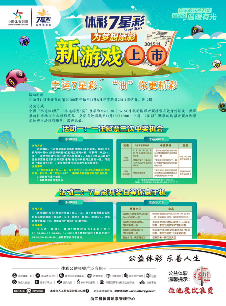各位小伙伴们熟悉的“买就送”活动又要来了!不过,这次的活动奖品有点不一样,不是彩票,不是礼品,而是丽水龙泉AAAA级景区门票! 本次活动自6月16日开售的体彩大乐透第21069期开始至7月17日开奖的第21081期结束,共开展13期。活动期间,在省内体彩实体店,只要您采用“7+3”“8+