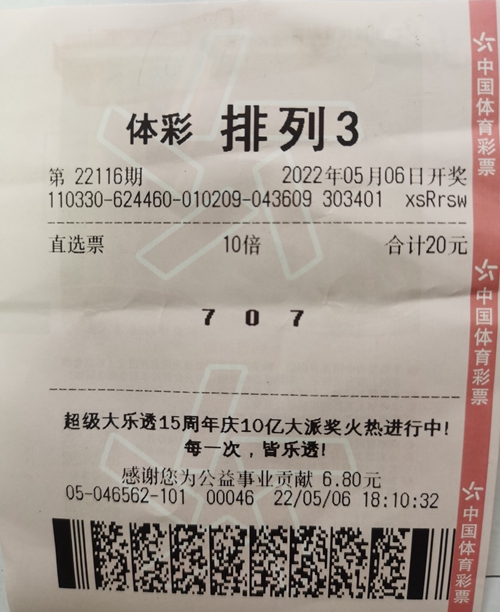 5月6日,第22116期体彩“排列3”开出“7、0、7”的中奖号码后不久,位于湖州市长兴县雉城街道海兴路298号的3305046562体彩实体店传来好消息,该店一位购彩者喜中“排列3”当期直选组合1注10倍,中奖金额共计10400元。 据了解,获奖者是一位资深的购彩者,家就住在实体店附近,长期以来
