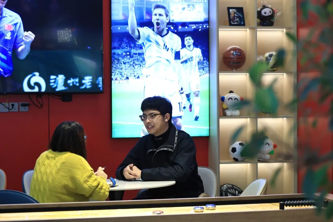 推门而入,更能感受到他作为 “彩二代” 的创新巧思。潮玩橱窗里、桌上沙壶、热门潮玩手办与体彩 IP “乐小星” 玩偶错落摆放 — 这是他观察到年轻人对潮玩的喜爱后,特意加入的元素,“想让大家一进来就觉得‘哇,这不是普通的体彩店’”;深入店内,“去纸化” 环保理念贯穿始终,电子屏循环播放体彩公益宣传片,取代了父母那辈常用的纸质宣传页,“现在年轻人都习惯看电子屏,这样既能传递公益信息,又符合环保趋势”;缤纷闪烁的流行语灯牌,是他和 00 后团队一起挑选的热门句子,“希望大家在这里不仅能购彩,还能感受到轻松有趣的氛围”。这些改变,让传统体彩店彻底摆脱刻板印象,变成了年轻人愿意驻足、拍照、交流的潮流空间。