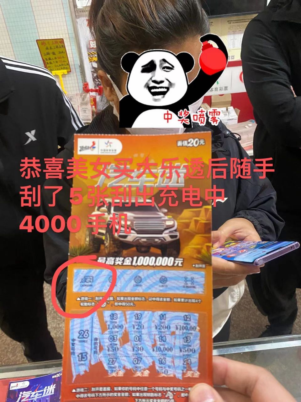 销售员介绍说,中奖者是第一次进店买大乐透的新人,先买了大乐透15元追加票,看见销售台面放置即开票新票推荐牌上20元面值的“汽车迷”,就随手买了5张,当刮出预埋符号“充电”,销售员很为新购彩者高兴,同时还告知该票现在正在搞活动,中奖啦!