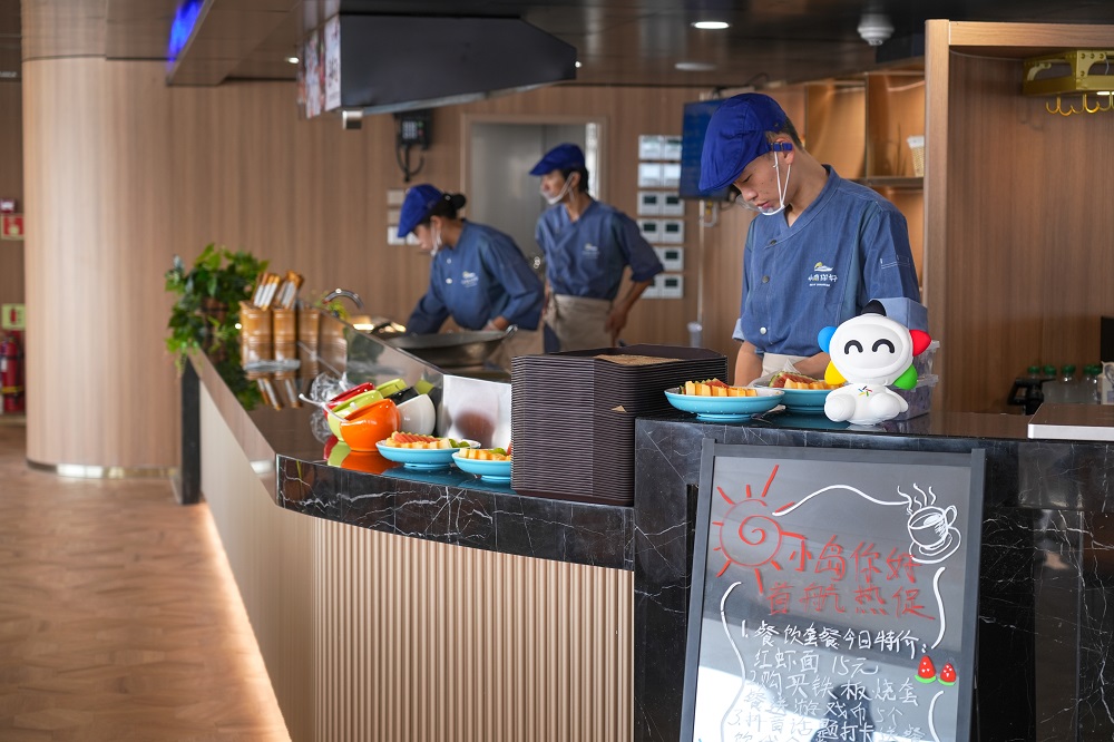 走进“小岛你好”号游轮一楼客舱,“中国体育彩票”“公益公信”标识醒目。