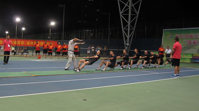 8月13日,丽水市第三届运动会(大众体育部)“体彩杯”拔河比赛在丽水市体育中心网球馆隆重举行。 上午7时40分举行开幕仪式,在丽水市体育场馆管理中心党支部副书记赵卉致开幕辞、运动员代表宣誓后,丽水市体育局局长蒋正鸿宣布比赛开始。随即,参赛运动员们进入紧张的竞赛状态。本次比赛分县级男子600公斤级、县