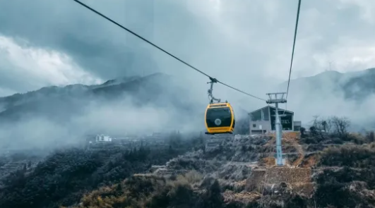 观云索道线路全长3880米,提升高度从海拔约200米到1000米,有28座支架,最高运行速度为6米每秒,上下站行程最短用时只需11分钟。坐于缆车内,悠悠然然在空中运行,腾着云,架着雾;飞过山野,越过田间;车在空中行,人在云中唱,绝妙风光尽收眼底。