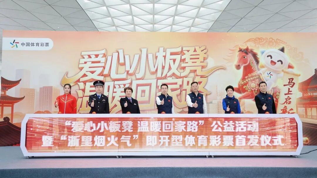 2月9日,2026年浙江体彩“爱心小板凳 温暖回家路”公益活动暨“浙里烟火气”即开型体育彩票首发仪式,在杭州西站温暖启动。