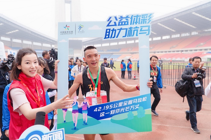 李子成完赛后,第一时间与浙江体彩零距离互动,与公益体彩助力杭马的宣传框合影留念,为公益体彩打call!