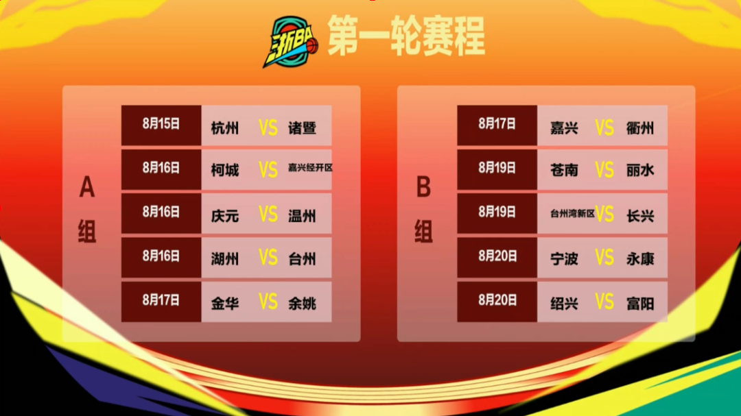 根据抽签结果,揭幕战之后,8月16日将率先展开三场比赛,分别是柯城VS嘉兴经开区、庆元VS温州,以及湖州VS台州。8月17日,A组最后两个对手金华在主场迎战余姚。B组的比赛从8月17日开始,嘉兴VS衢州。8月19日有两场比赛,分别是苍南VS丽水、台州湾新区VS长兴。8月20日,宁波VS永康、绍兴VS富阳。由于A、B组捆绑落位,因此A11舟山和B11普陀首轮轮空。
