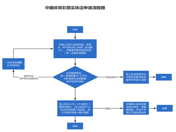 凡符合上述条件有意经营体育彩票代理销售实体店者,申请者可在浙江政务服务网或者下载“浙里办”APP,注册登录后搜索“体育彩票阳光征召”,选择“【浙江省】体育彩票实体店阳光征召”办事服务进行报名,并在邀约(征召)计划时间内将申请材料上交县区管理站。邀约(征召)结束后市中心业务科受理、审核、汇总申请材料的基础上,按要求组织进行考察评估,对符合增点要求的申请人进行公示,提出布店初步方案,签订合同后报省体育彩票管理中心审核批准。